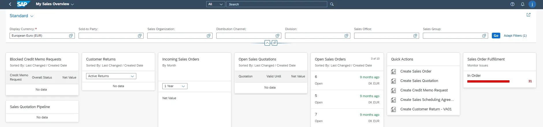 View a selection of options via Fiori cards to show dynamic data related to inbound orders, outbound deliveries, returns, quotations, customer contacts, credit memos, etc. all from one place.