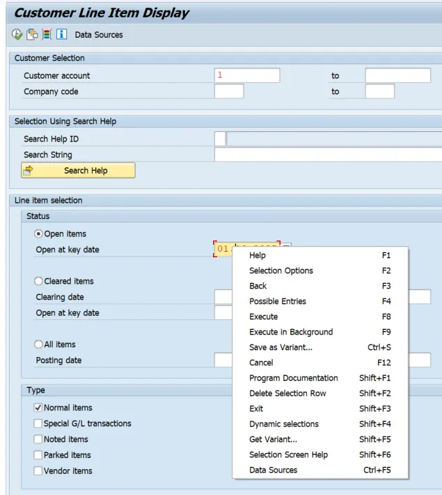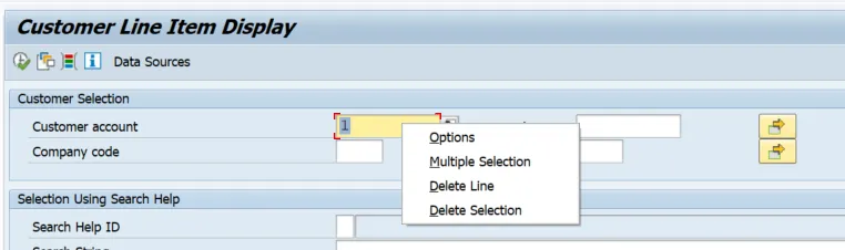 a. “Customer line item display” in finance (transaction FBL5N). Right clicking on the Customer account field in this transaction will give you limited options, as below. These options are also available by clicking on the multiple options box next to the field. So not too much in the way of help here.