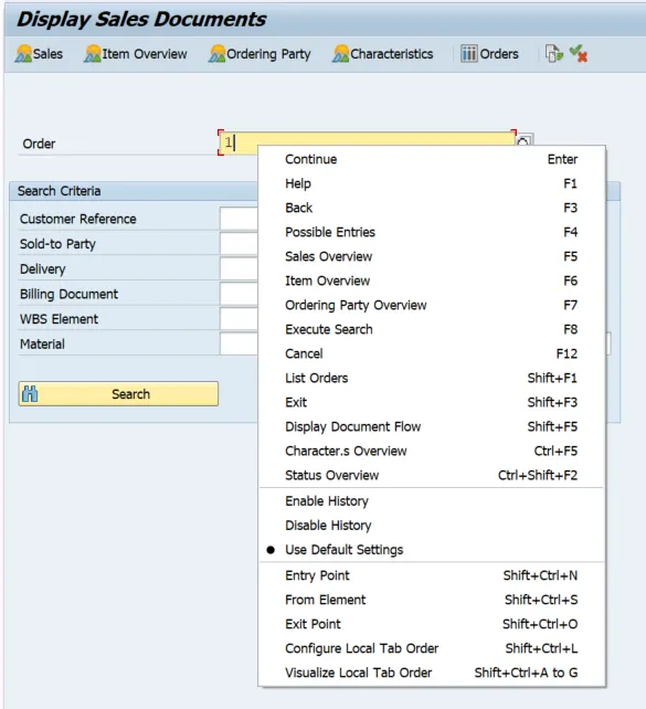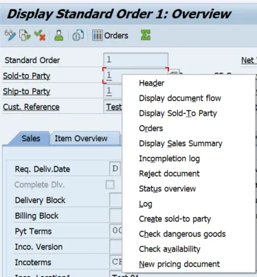 b. Display Sales Order in sales and distribution (transaction VA03). A right click on the Sold-to Party field here offers a good degree of functionality, which is only available in different areas using menu paths and alternative icons. Again – useful to see all in one place.