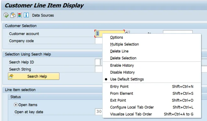 a. “Customer line item display” in finance (transaction FBL5N). CTRL+right click against the Customer account field offers some useful settings. The normal settings which are available with right click are available but we also see some additional settings here (all of which are LOCAL to your SAP workstation):