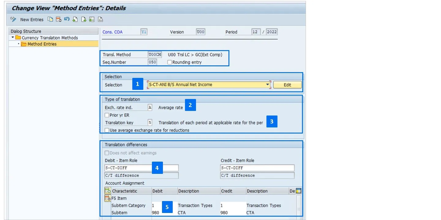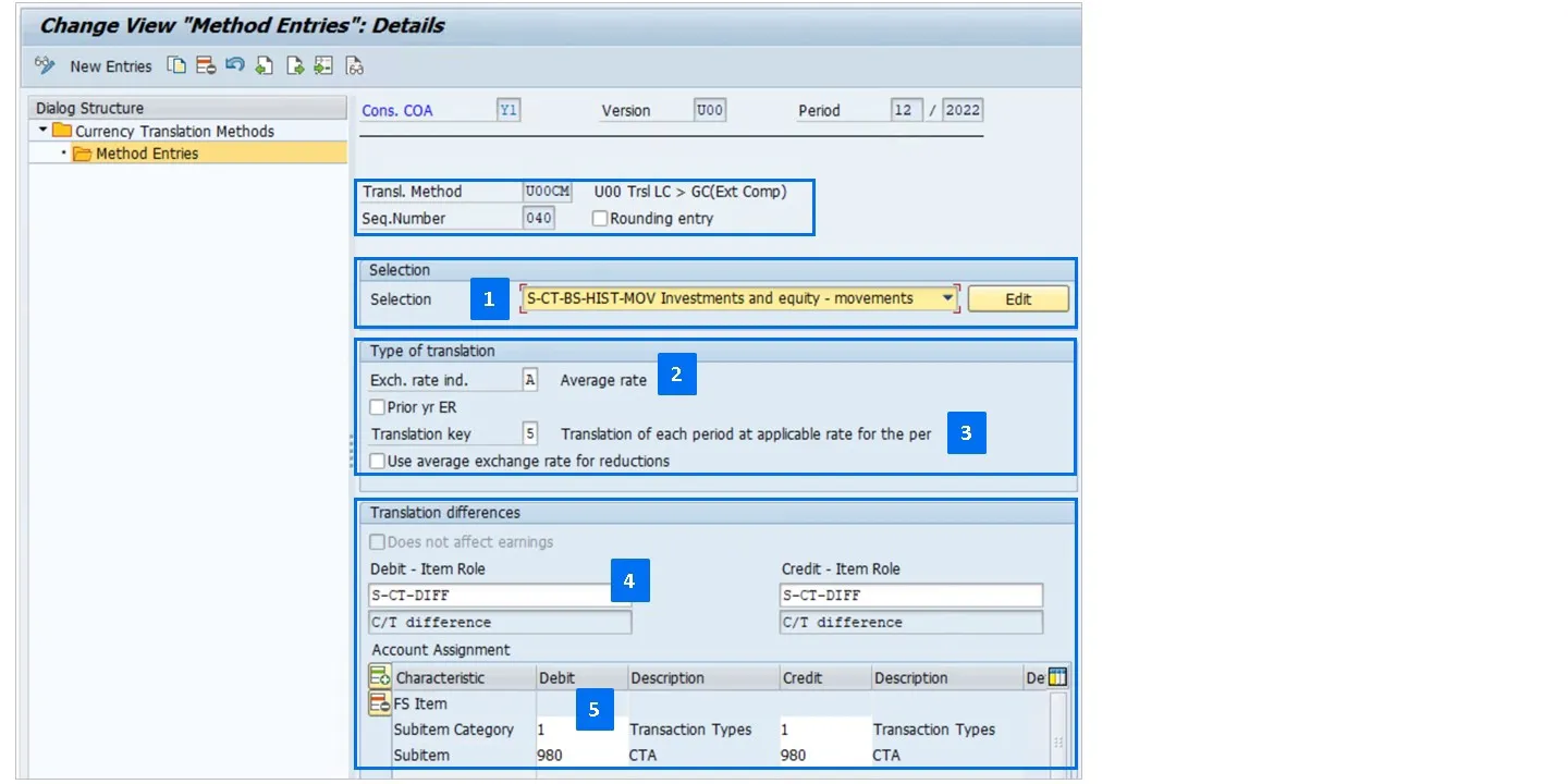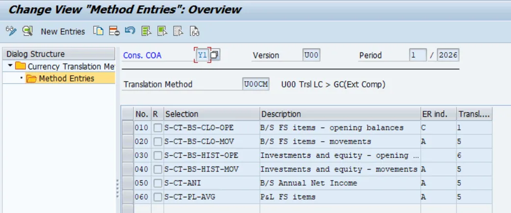 The currency translation (CT) methods define how the currency translation takes place depending on the financial statement (FS) items and subitems.