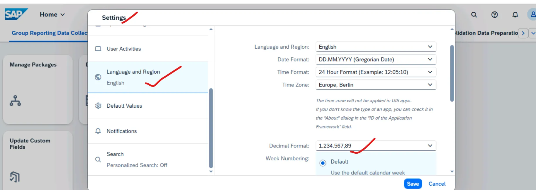 • When you set your language and region settings on the SAP Fiori Launchpad, you should not only determine the language of the application but also the thousand and decimal separator used in SAP S/4HANA Finance for group reporting Data Collection